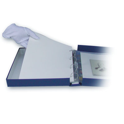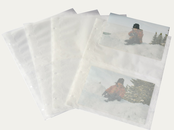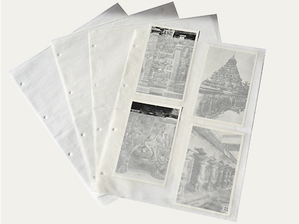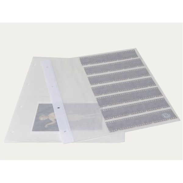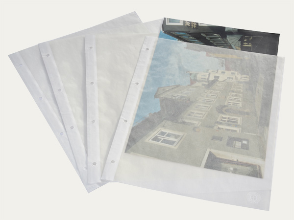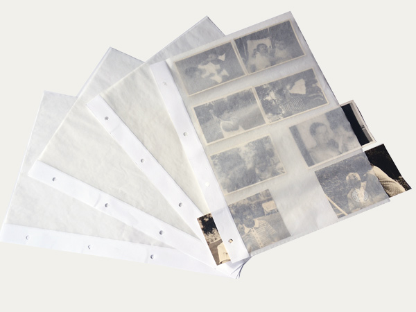 Albumpagina's, gemaakt van 40 g/m², ongebufferd transparant papier, in drie verschillende uitvoeringen, voor de berging van o.a. fotografisch materiaal. De pagina's zijn voorzien van 4 perforaties met een afstand van 80 mm. Zowel het papier als de toegepaste lijm voldoen aan de PAT test.